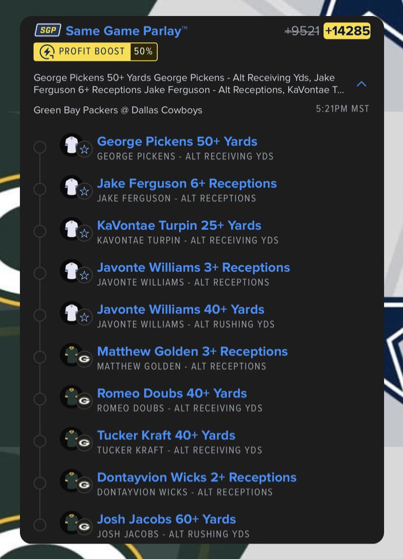 Packers vs Cowboys SGP +14285 Last play for me for the day, I’ll be back tonight with two slips for tomorrow. https://t.co/MpGtA6YEpx